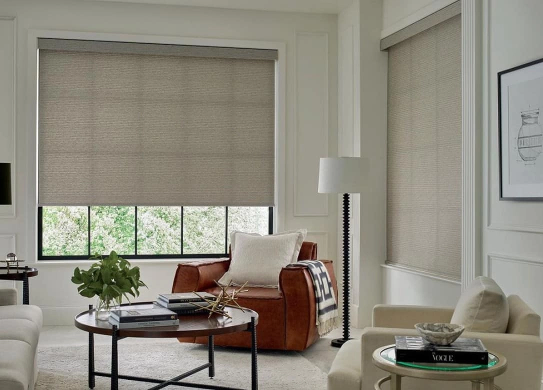 For a modern twist on window shades, try the Designer Banded Shades by Hunter Douglas. These gorgeous treatments combine alternating sheer and solid fabric bands into a single shade. This allows your shade to operate seamlessly, and it also provides unique lighting, so the beams of the sun can enter your room in an elegant and soft way. This is the perfect solution for view-through capabilities and adds a modern touch to any space.