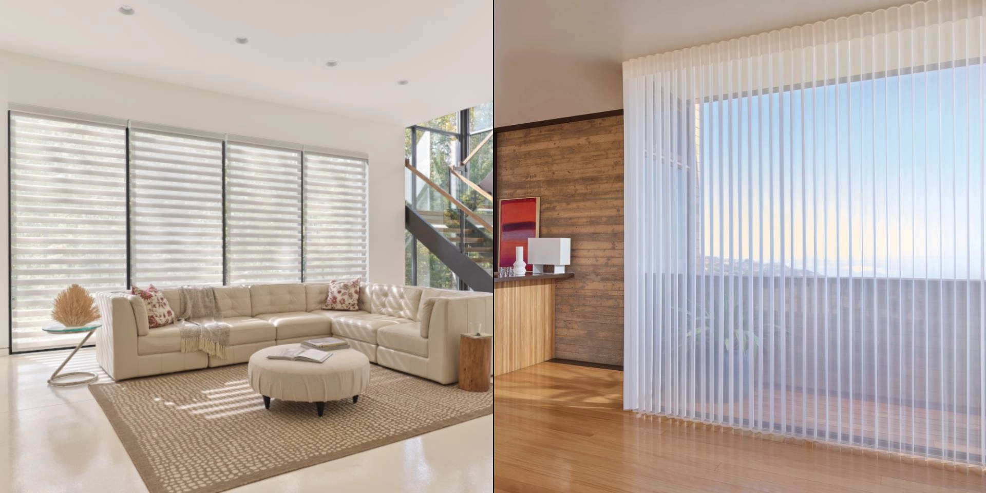 Sheer shades, on the other hand, transform bright sunlight into a soft glow by combining fabric vanes suspended between sheer panels. Hunter Douglas offers several striking sheer shades, including the light-diffusing Silhouette® Sheer Shades, sculptural Pirouette® Sheer Shades, and vertical Luminette® Sheer Panels.